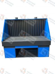 Стол СШЗ-01-04 предназначен для установки на нем изделий при проведении шлифовальных, зачистных и других работ. Надежная цельносварная стальная конструкция оборудована собирающим контейнером и выдвижным ящиком для сбора и удаления мелких отходов процесса зачистки, двумя тумбами с полками для хранения деталей и инструмента. Рабочая поверхность стола СШЗ-01-04 образована съемными стальными решетками. Конструкция стальных решеток предотвращает проваливание деталей в собирающий контейнер стола. Удаление газовой смеси и пыли, образующихся в процессе зачистки, происходит через жалюзи, расположенные на задней вытяжной панели экрана, и съемные стальные решетки на поверхности стола. Подключение стола к вытяжной системе помещения производится с помощью фланцев, расположенных на боковой стенке стола и верхней обшивке экрана. Боковые стенки экрана со звуконепроницаемым материалом снижают уровень шума, возникающего при работе шлифовальной машинки. Открытие боковых стенок позволяет обрабатывать на столе не только малогабаритные, но и длинномерные изделия.