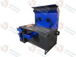Рабочая поверхность стола представляет собой съемную чугунную решетку, на которой производятся сварочные работы. Через вырезы в решетке производится нижний отбор газовой смеси и пыли, образующихся при сварке. Под решеткой расположен ящик для сбора окалины и других мелких отходов процесса сварки. Удаление газовой смеси, образующейся при сварке, может также осуществляться через вырезы, выполненные в верхней части вытяжного зонта. Система воздуховодов оборудована встроенной заслонкой, регулирующей интенсивность отбора воздуха. Управление заслонкой осуществляется поворотом рукоятки, расположенной на правой боковой стенке. Для более эффективного направления газового потока в вытяжную систему, по передней кромке в верхней части зонта установлен подвижный козырек, фиксируемый в любом положении. С лицевой стороны стола расположен выдвижной колчан для электродов, ящик для инструмента. Местное освещение стола производится двумя светильниками, установленными на столешнице. Пульт управления освещением и вентилятором расположен справа под столешницей.